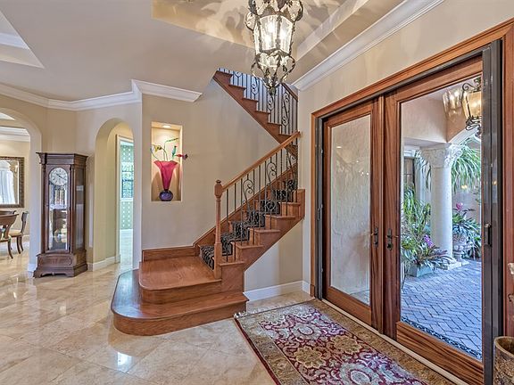 This beautiful custom home is located in The Cove, a private gated community centrally located just off Donald Ross Road. The Mediterranean style home has 4 bedrooms, 4.5 baths, 2 car garage, pool, and private dock. Quality built in 2006 of CBS construction with all impact windows and doors the home boasts 4889 total sq ft, and 3818 under air. Perfectly situated on .30 acres this home has west front exposure and east back exposure. Special features of this home include private dock with lift, paver driveway and walkways, covered front entry, marble floors throughout the main living areas and baths, oak staircase with wrought iron railings, pecan second floor landing, recessed lighting throughout, phantom screens for all exterior doors, indoor/outdoor Sonos surround sound, and new epoxy garage floor. Dramatic glass double door entry leads to the welcoming foyer. Step into the formal living room boasting gas fireplace, coffered ceiling, crown molding, and glass doors to the covered lanai. The formal dining room offers decorative columns, tray ceiling, crown molding and butlery with Sub Zero 60 Bottle wine/beverage cooler, onyx countertop, glass display cabinetry, and sink. Gourmet kitchen with Thermadore 5 burner gas stove, Miele range hood, GE Monogram double door refrigerator with paneled front, GE microwave, Bosche dishwasher, coffered ceiling, crown molding, wood cabinetry with glass display doors, breakfast bar with pendant lighting, soft close cabinetry and drawers, granite countertops, custom glass tile backsplash, pantry, porcelain sink, and casual dining alcove. The family room is open to the kitchen with tray ceiling, plantation shutters and glass doors to the patio. First floor powder room has agate countertop, raised bowl sink, and marble floor. Luxurious first floor master suite has double door entry to the private foyer with marble floors. Carpeted master has his and hers walk-in closets with built-ins, wet bar, plantation shutters, tray ceiling, sitting area, and access to the lanai. The master bath has his and hers separate vanities, Murano Glass sconces, glass enclosed step down shower, and jetted tub with walled garden view. The first floor has a second suite with carpeted floors, two reach-in closets, and attached bath with step down shower, and single vanity. Large laundry room with Fischer and Paykel top load washer and dryer, utility sink, and additional storage. The second floor boasts a second master suite with a tray ceiling, private balcony, water view, large walk-in closet, crown molding, coffered ceiling, and spacious attached bath with double door entry, marble floors, jetted tub, glass enclosed shower, and his and hers separate vanities. The second floor guest suite has carpeted floors, reach-in closet, ceiling fan, and private bath. The office has built-ins, carpeted floors, ceiling fan, custom window treatments, and a private balcony. Outdoor entertaining space includes a covered lanai, multilevel tumbled marble patio, summer kitchen with Solaire Infrared Grill, private pool and spa. Mature landscaping provides privacy.