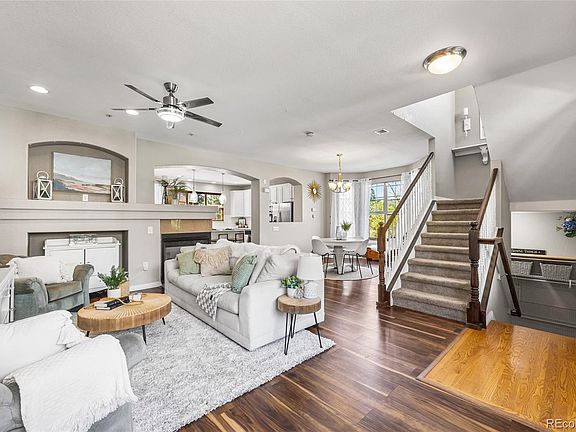 Welcome to this beautifully updated end-unit townhome, where style meets convenience. Step into the modern kitchen, featuring sleek new Corian countertops, an oversized island with a striking waterfall edge, and a stylish backsplash. The updated cabinetry and newer appliances complete this contemporary look. The light-filled living and dining areas boast natural hardwood floors and a double-sided fireplace, creating a warm and inviting atmosphere. Upstairs, you'll find three spacious bedrooms, including a primary suite with a luxurious five-piece ensuite bath and a large walk-in closet. The finished basement offers versatile space, currently set up as a theater room—plus, the projector can be included with the sale. Outside, enjoy the large side deck, fully fenced for privacy and easy maintenance. As part of the Village of Five Parks community, you’ll have access to fantastic amenities such as a community garden, pool, clubhouse, fitness center, park, playground, trails, and nearby restaurants. Say goodbye to shoveling and mowing—this townhome is designed for low-maintenance living. Don't miss your chance to own in this vibrant community!