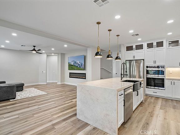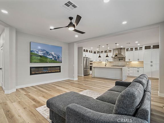 HUGE Price Improvement!! Discover elevated living in this exquisite 5-bedroom, 3-bathroom home with generous space and thoughtful luxury upgrades. Step into an open-concept design that seamlessly blends upgraded wood flooring, recessed lighting, and elegant plantation shutters. The heart of this home is a chef's dream kitchen, featuring a dazzling $15,000 Taj Mahal quartzite island, underlit to create an inviting glow. This stunning kitchen also offers custom cabinetry, upgraded countertops and backsplashes, a triple oven, an 8-burner Forno stove, stainless steel appliances, and an instant hot water dispenser for ultimate convenience. The living room is equally impressive with an electric glass fireplace below an included flatscreen TV. High ceilings and unique lighting fixtures add a sophisticated ambiance throughout. The primary suite on the main floor includes a spacious ensuite bath, complete with double sinks, a luxurious soaking tub, and custom fixtures, creating a personal oasis. Outside, an expansive covered patio with recessed lighting overlooks professionally landscaped grounds, enclosed by a beautiful wooden fence. This outdoor space is perfect for gatherings, providing the ideal setting for relaxation and entertainment alike. Additional features include a 3-car garage with epoxy flooring, a water softener, central heating and air conditioning, a dedicated laundry room, and custom floorboards. Conveniently located near Eastvale Gateway, which boasts over 75 shops and restaurants, this home offers both modern convenience and timeless style. It’s also within the highly rated school zones of Clara Barton Elementary (8/10) and Eleanor Roosevelt High School (9/10) as rated on Great Schools dot com, making it an exceptional choice for families seeking quality education options