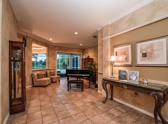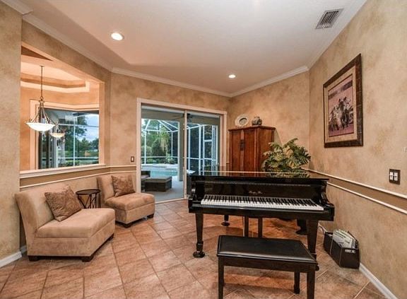 This spacious home is located on a stunning lake view home site in Greenbrook Village. The entry boasts double glass doors that open to the formal living and dining room with neutral tile floors, extensive moldings and triple step tray ceiling. The functional kitchen boasts quality wood cabinetry, built in desk area, granite counters and beautiful tiled back splash. The breakfast bar leads to the casual dining area with tray ceiling and large, open family room. The sliding doors open to a spectacular lanai with stunning lake views and a salt water pool and covered living area, the perfect space for entertaining family & friends. The luxurious owner's retreat features walk-in closets and a sitting area with sliders leading out to the lanai. The spa-like bath offers separate vanities, garden tub and walk-in shower. There are 2 additional bedrooms downstairs sharing a bath as well as a cabana bath in the back of the home. The upstairs offers a spacious bonus room as well as a very generous guest bedroom and bath. Richly detailed with upgrades galore, this home is not to be missed!