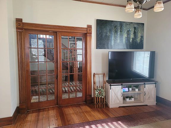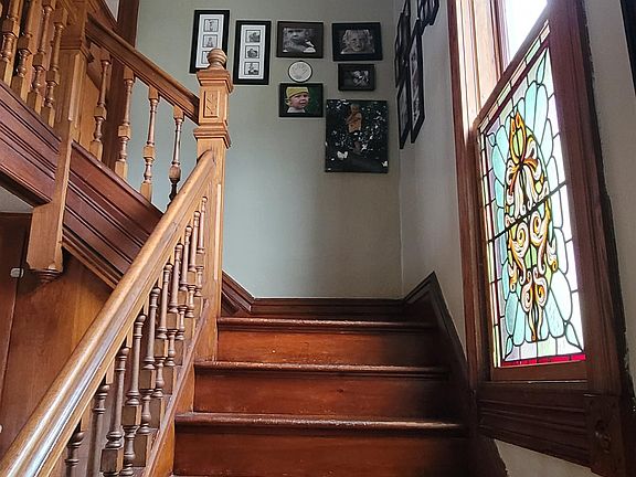 This turn of the century beauty is everything you could ask for! All the charm of 1800's architecture, with the updates and conveniences of modern day. HUGE LOT - 140 x 220, Large 3 car garage, Man Cave or She Shed with insulation, gas heat, running water and a working bathroom!!!! Fenced in yard with a patio, tree house/fort and a large play set, garden area and dog run. Wrap around porch, Steel siding, beautiful design work and roof lines. Indescribable original hardwood floors, built-ins, original French doors, stair case and transoms over all the interior doors, claw foot tub in the upstairs and onyx shower in the main floor bathroom. The stained glass window does not stay.