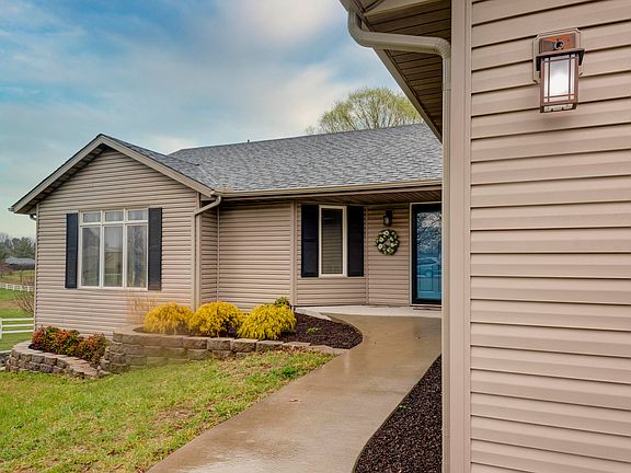 Walk out basement home in Nixa on approximately 1.4 acres! Living room is spacious with hardwood laminate floors, built-in bookshelf, pellet stove, and wonderful view. Lots of updates in the kitchen with newer tile flooring, stainless steel fridge, and dishwasher. Master bedroom is on main level with hardwood laminate floors. Master bath was remodeled with wall wainscot overlay and new vanity. Guest bedroom on main level has its own full bath that was remodeled with new tub, tile, vanity, and sliding door. Half bath on main level was completely remodeled as well. In the basement you will find plenty of room with a family room, 2 more bedrooms, full bath, a theater room, and finished storage room. Outside you will find lots of landscaping and a beautiful wood deck that was recently rebuilt and added onto. New roof in March 2020. Quiet neighborhood with very little traffic due to being located on a no access road. Come take a look!
