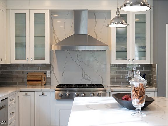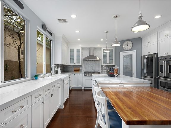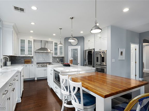 Welcome to The Woodlands Retreat, a captivating home located in the sought-after Woodlands subdivision in the heart of Summerlin. Offering over 3,400 square feet of thoughtfully updated living space, this residence boasts four bedrooms, including a spacious downstairs primary suite with a stunning marble-tiled bathroom and elegant marble countertops. The timeless interiors feature rich wood floors throughout, a white shaker-style kitchen, quartz countertops, and a beautiful butcher block island. The expansive backyard backs to a serene greenbelt, providing exceptional privacy and tranquility. This home truly embodies comfort and elegance in one of Summerlin's most prime locations.