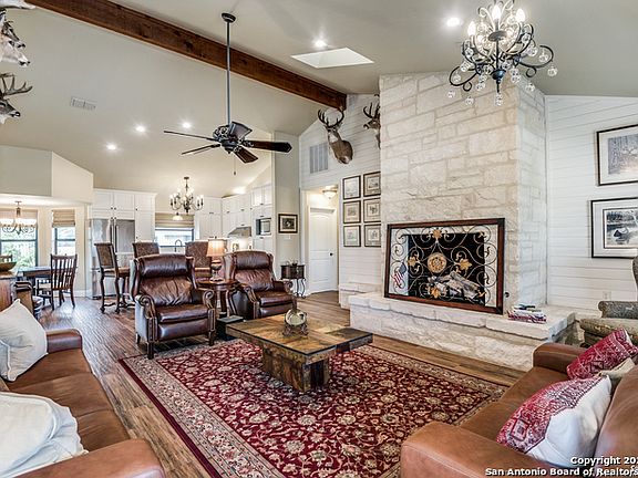 Perfectly designed for a lifestyle of Hill Country Living showcasing exquisite craftsmanship throughout. The family room opens to the custom Jenn-Air gourmet kitchen with stainless steel appliances and an over sized island offering bar stool seating. New water softener, hot water tank & RO have also been installed. High ceilings, gleaming ceramic tile flooring, floor to ceiling rock fireplace and Quartz counters are throughout the completely remodeled home to include the newly painted interior and exterior. Custom Hunter Douglas window coverings adorn each window and the enclosed sun porch and half acre lot make this charming property perfect for a Hill Country get away with easy access to shopping, restaurants and vineyards. A gas hook up for your BBQ grill is also available and mature landscaping and numerous trees surround the serene property.