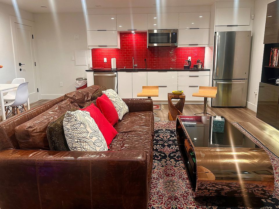 Restoration hardware leather couchBuilt-in bookshelfLarge green backyardSpacious ikea closet systemKing-size bed setNewly renovated modern unitFull kitchen with kitchenware