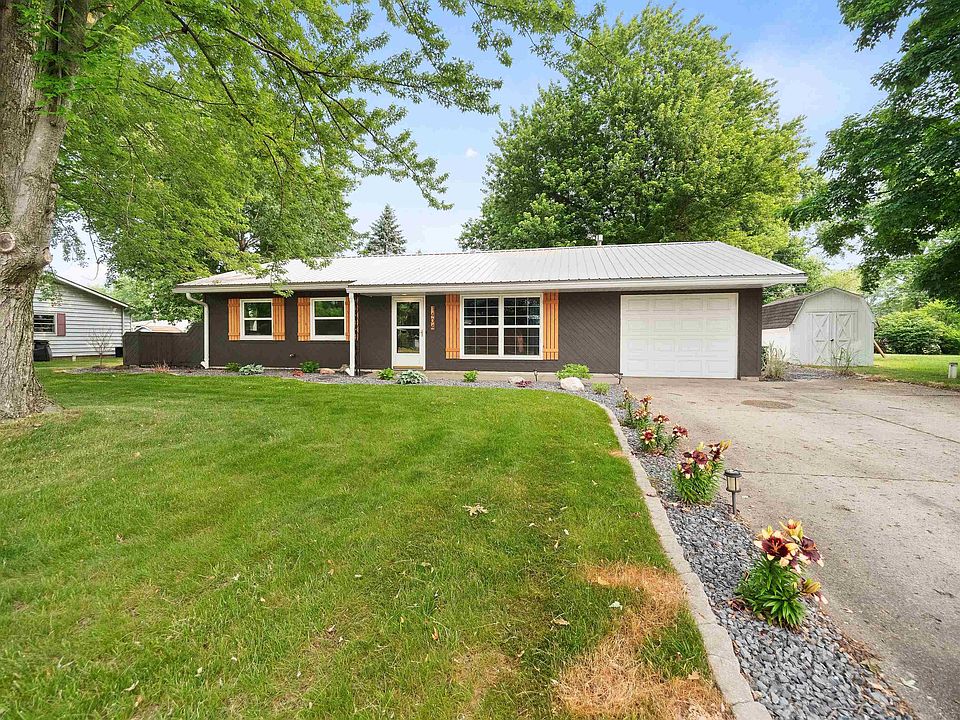 Welcome home to this charming updated ranch with lots to love & much to offer including multiple living spaces, open concept & private feeling back yard—minutes from downtown & Zimmer Biomet! Located in Melody Acres off W Lake St, in quiet area with no through traffic, this 4 bedroom, 2 full bath home has been impeccably maintained from outside in & is completely move-in ready! Nestled on tree-lined street & 0.34 acres, attractive exterior is sure to catch your eye from moment you arrive—tidy rock flower beds are blooming adding bright pop of color that matches contrasting shutters. Newer metal roof provides modern touch to this 1959 built frame with 1 car attached garage & oversized drive for additional parking. Covered front entry opens to bright & welcoming atmosphere complemented by recently installed flooring, gray walls & white trim—the perfect backdrop to your own personal style! Inviting front living room gets plenty of light from big picture windows & is open to dining area; on opposite side, a cozy family room featuring beautiful floor-to-ceiling white brick gas log fireplace & sliding glass doors to back patio. Central eat-in kitchen has everything you need with abundant cabinetry, SS appliances, recessed lighting plus spacious dining zone. Laundry room, back door & garage access off kitchen. Split bedroom floor plan means extra privacy with a generous primary bedroom off the family room boasting a large walk-in closet & aesthetically pleasing en suite bath with modern hard surface vanity, round framed mirror & walk-in shower. 3 more comfortably sized bedrooms are located at the front of the house as well as the main shared bath that matches the primary bath (although with a tub/shower combo) with ample storage throughout. Back yard has not 1 but 2 patios (1 cement, 1 stone) with a partial 6’ wood fence making the space feel intimate & secluded along with the L-shaped nook of the house & free standing shed for all your outdoor tools & toys. Ideal spot for grilling & chilling, lounging, entertaining or simply relaxing with a cold drink at the end of a long day. Convenient location with easy access to nearby shopping & dining in the heart of downtown including local favorites such as Oku Roji, One Ten Craft Eatery & Anthology Whiskey Room. US-30 is only a few minutes away & you can get to Plymouth, Goshen & Columbia City in half an hour with South Bend & Fort Wayne just a little further out. This one won't last long—take action today!