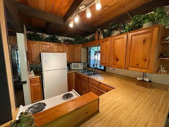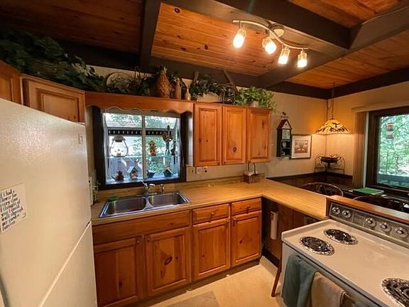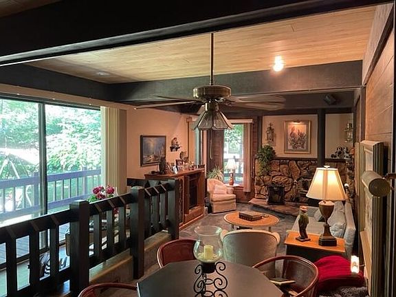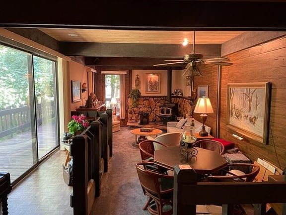 Charming chalet style home with private lake access in Hillcrest Association, just a short walk to beach and lakeside park. 3 bedroom, 2.5 bath home with large family room and open living, dining and kitchen area. The two upper level bedrooms each have a door wall opening to a private deck, the interior features natural wood and beamed ceilings, updated kitchen cabinets and wood burning stove. Beautiful wooded setting on a corner lot with second lot for additional yard area, several unique outdoor seating areas to enjoy nature including the 65 foot deck. Attached garage plus carport, Andersen windows, being offered mostly furnished and ready to move in. Note, there is a waiting list for boat mooring slip.