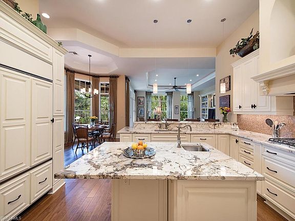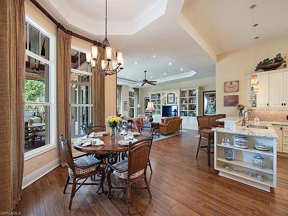 H.16512 - A happy marriage of classic architecture and re-mastered contemporary interior has created a sophisticated, yet comfortable home for private lakefront living. Surrounded by nature, with vistas of Arthur Hills' Audubon Sanctuary hole #13 framed by sunset skies, the over-sized estate property offers the perfect setting for a relaxed country-club lifestyle. Gracious living spaces flow seamlessly, complemented by four bedroom suites, all with private baths, and a private office large enough for two work spaces, library shelving and a bay-windowed reading nook. A sprawling lanai features disappearing screens, a pool bath and multiple sundeck areas around the gas-heated pool and spa. The perfect home to entertain friends and welcome family! Over 6,800 square feet under roof incorporate parking for 3 cars, with one air-conditioned bay. From the open-concept chef's kitchen with gas cooking and walk-in pantry to an expanded great room with large picture windows, from marble and wood floors to high ceilings with exquisite detailing, and from impact-rated hurricane protection to upgraded appliances and mechanicals ~ this custom estate home is sure to impress.