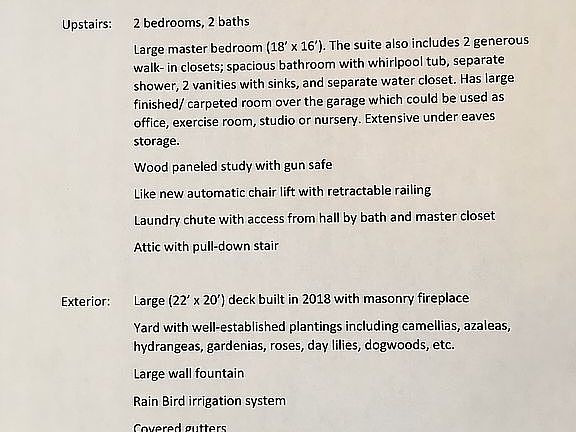 See info sheets in photos. Spacious Heathwood home, ten minutes from Main Street and the Capital and 5 minutes to I-77. Large deck with fireplace adjoins generous family room off custom kitchen, great for gathering and entertaining. Comfortable 2nd floor master suite with 2 walk-in closets opens to roomy master bath and large finished room over the garage. Square footage does not include a bonus sunroom (200 sq ft). Extra-large garage (24’ x 30’) easily holds Suburbans, etc. Abundant storage throughout. Great home for a family!