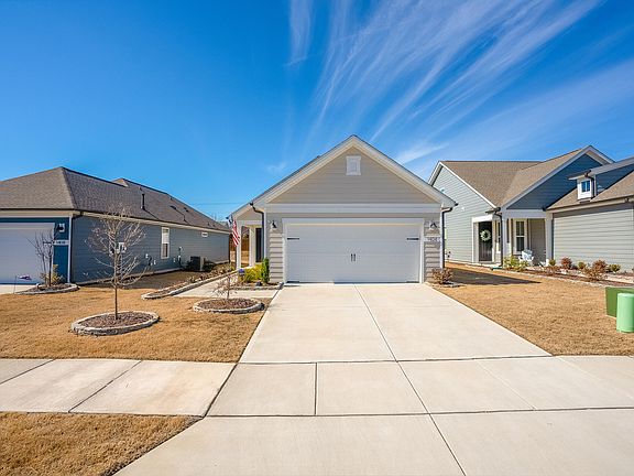 Discover effortless living in this stunning 3-bedroom, 2-bathroom, one-level ranch-style home in the highly sought-after Del Webb Carolina Gardens community. Built in 2023, this Compass floor plan spans 1,420 sq. ft. and is filled with premium upgrades for comfort and convenience. Situated on a cul-de-sac and just a short walk to a pond with cascading fountain, this home offers a peaceful retreat where you can sit and enjoy the serene water views. Step inside to find luxury vinyl plank flooring, an open-concept layout, and a beautifully designed kitchen featuring stainless steel appliances, with the refrigerator conveying. The master suite boasts a tray ceiling, a spa-like ensuite bath, and a walk-in closet with a laundry chute connecting directly to laundry room for added ease. A tankless water heater ensures endless hot water and energy efficiency. Outdoor living is just as impressive, with stacked stone landscape edging, a covered and screened-in patio, and a custom pergola—perfect for relaxing or entertaining. The garage with a 4' extension offers extra space for storage or hobbies. Residents of Carolina Gardens enjoy resort-style amenities, including: Indoor pool & outdoor pool, State-of-the-art fitness center, Lighted pickle ball, tennis, and bocce courts, Scenic walking trails & Vibrant clubs & activities HOA fees cover all landscaping and lawn care, as well as Spectrum high-speed internet, cable, and access to all amenities. Don't miss this opportunity to own a home in this incredible community!