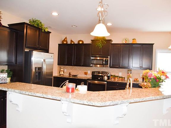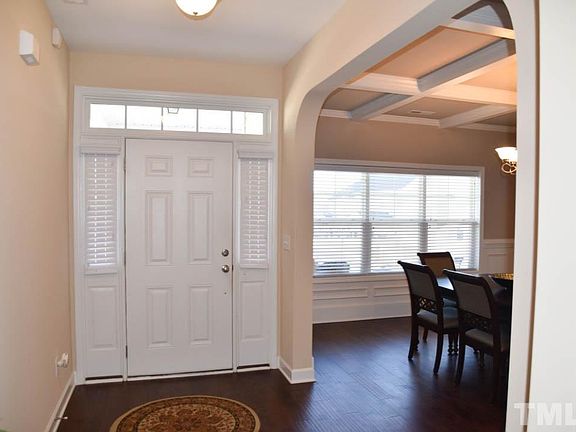 Craftsman style home with inviting front porch; Great open floor plan; Large chef's kitchen w/stainless appliances, granite, tile backsplash, walk-in pantry opens to breakfast room and family room. DR with beautiful coffered ceiling & wainscoting. 1st floor in-law suite with full bathroom. Large Master bedroom boasts tray ceiling, gorgeous bathroom w/garden tub & shower, large walk-in closet. Beautiful arched entryways, mud room, covered patio overlooking wooded back yard. 20 mins to downtown Raleigh.