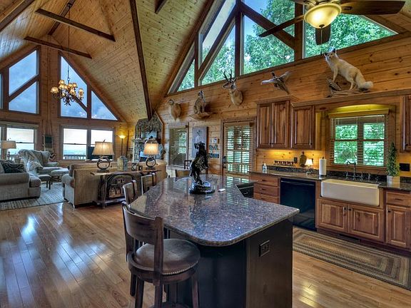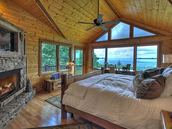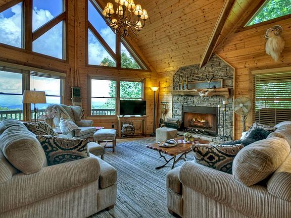 THE ULTIMATE ENTERTAINMENT CABIN! Meticulously maintained cabin that will have you calling it YOURS as soon as you walk through the door! Nothing has been overlooked in regards to maintenance - this UPSCALE cabin features a full wrap around deck leading to the main level, screened-in, outdoor fireplace; spacious great room w the prow front showing off the tri-state, long range, multi-layered mountain views! Great kitchen layout w island overlooking the great room; dining area; the MBR features it's own fireplace & large windows allowing you to wake up to the layered mtn views; tile showers; jetted tub; the lower level features a beautiful bonus room; wet bar; 2 br's & a bath as well an addt'l outdoor fireplace! All paved, easy access! This would be a great rental - comes furnished with upscale furnishings from Jerry's Mountain Furniture!
