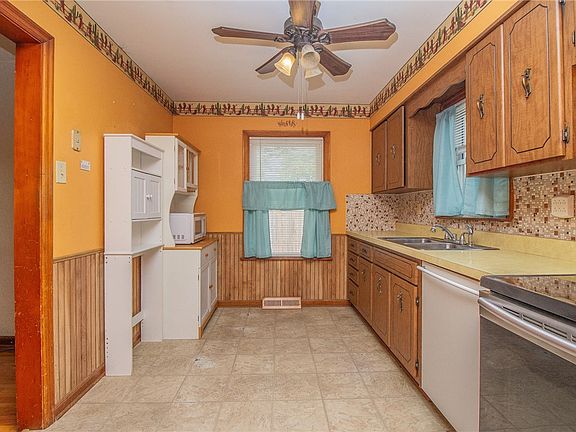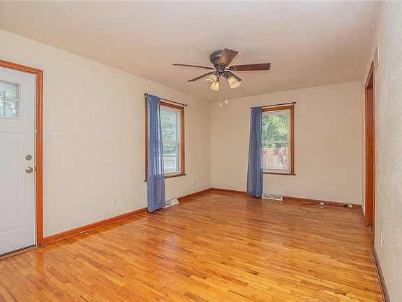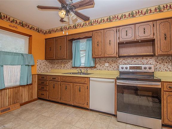 PRICE is RIGHT & this Home includes a 2 CAR GARAGE!! Hardwood flooring flows from living room to one of bedrooms. Original cabinetry can be found in the kitchen w/tiled backsplash. Full bath separates one bedroom from walk-through 2nd bedroom that is perfect for an office & leads to oversized master. Updates include newer water heater, c/a-2024 & replacement windows. Cabinetry & shelving adds extra storage in the laundry/mudroom. Step out of master through the sliding doors that provide a 2nd back entrance to the home. Here you will see the large raised patio that overlooks fenced yard & a great GARAGE!!