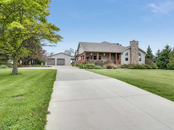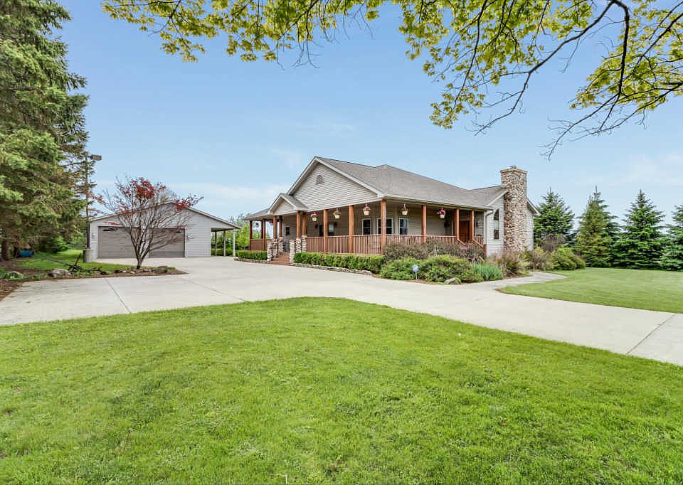 This beautiful ranch style home exudes country living charm! Enjoy the privacy of living on 1.3 acres while relaxing on the wrap around porch. Large kitchen has an abundance of custom oak cabinets, corian countertops and eating nook. Stunning living room with vaulted ceilings, floor to ceiling natural stone fireplace with temperature control which will heat the whole room. Master bedroom with walk-in closet, split double vanity, custom oak cabinetry, jetted soaker tub and double walk-in shower. First floor laundry. Rustic lower level finished with three large bonus rooms, rec room, dinette and free-standing wood burning stove. Car enthusiasts dream = (40x50 ft) four plus car garage with heated floor, water, electricity, cabinetry and 12 ft. concrete overhang.Additional parking spaces
