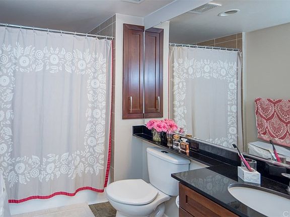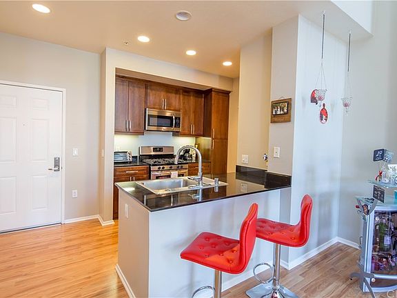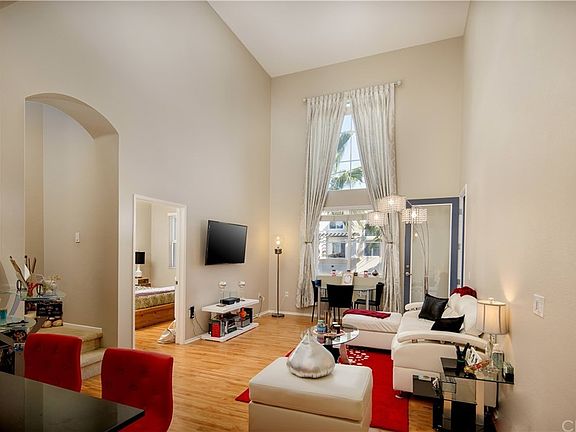Located on the top level of Irvine's luxe Avenue One complex, this 2 bedroom, 2 bath condo impresses with breathtaking high ceilings and large windows. The functional floor plan is designed with one bedroom on each wing for ultimate privacy. The spacious and airy great room centers around a gourmet kitchen with stainless steel appliances and granite counters. Substantial windows drench the interiors in natural light and a private deck offers additional entertaining space with views of the beautifully manicured grounds. A second floor loft opens to the first floor below and creates a large flexible space perfect for an office or secondary family room. The master bedroom features mirrored closet doors and ensuite bath while the guest suite includes a walk-in closet and direct access to the exterior deck. Incredible Avenue One amenities include a resort-style junior Olympic swimming pool, indoor basketball court, fitness center, putting green, fireplace and social spaces including alfresco dining area and barbecues. Located in sought-after Irvine, the central location is just a stone's throw from shopping, dining, John Wayne Airport, and the University of California, Irvine (UCI).