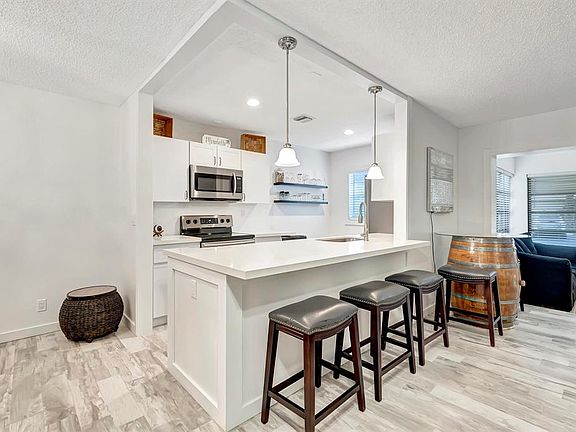 Quartz countertopsBright updated kitchenStainless steel appliancesWalk-in closets