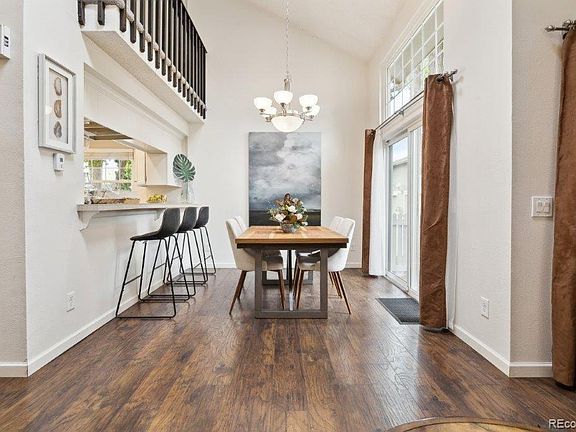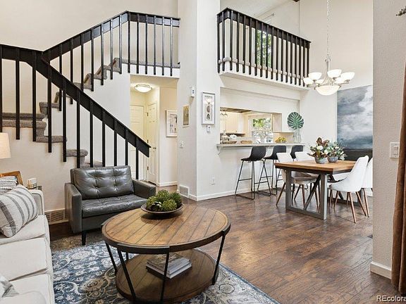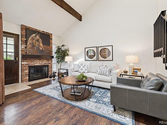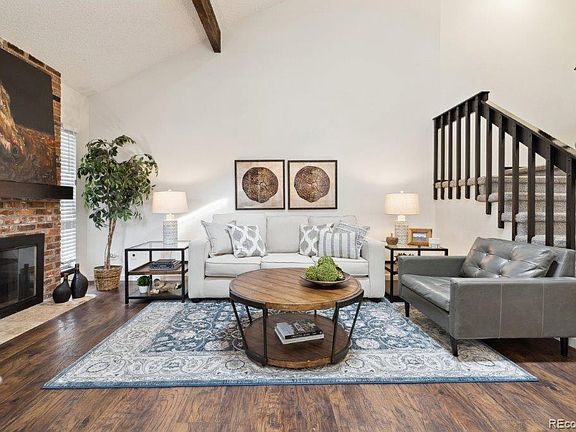 Charming end unit in lovely Quincy Hill Townhome community. Natural light pours in through the many windows, creating a warm and welcoming feeling. Living Room is graced by a vaulted ceiling with exposed wood beam and skylight. Brick surrounded gas fireplace will keep you warm on cold winter nights. Attractive wide plank wood style flooring throughout main level. Dining Room also vaulted with skylight and upper windows. Sliding door opens to fenced front patio. Great kitchen features marble countertops & backsplash, stainless appliances, canned lights and handy breakfast bar. All kitchen appliances included. Primary Bedroom can nicely accommodate your king-sized furniture. Adjoining updated ¾ bath and 2 closets. A second upstairs bedroom is served by a full bath. Bonus loft space is ideal for a home office. Extensive additional living space in the finished basement which offers a spacious Family Room and a 3rd bedroom with ¾ ensuite bath ~ perfect for out-of-town guests. Laundry area with included Samsung washer & dryer. 2 car attached garage with storage area. Great location ~ conveniently located near shopping, restaurants and a short distance to Cherry Creek State Park. Don't miss this one!