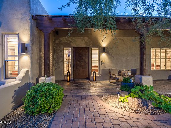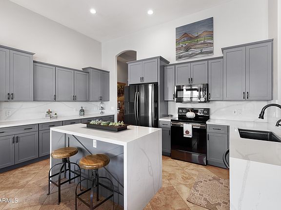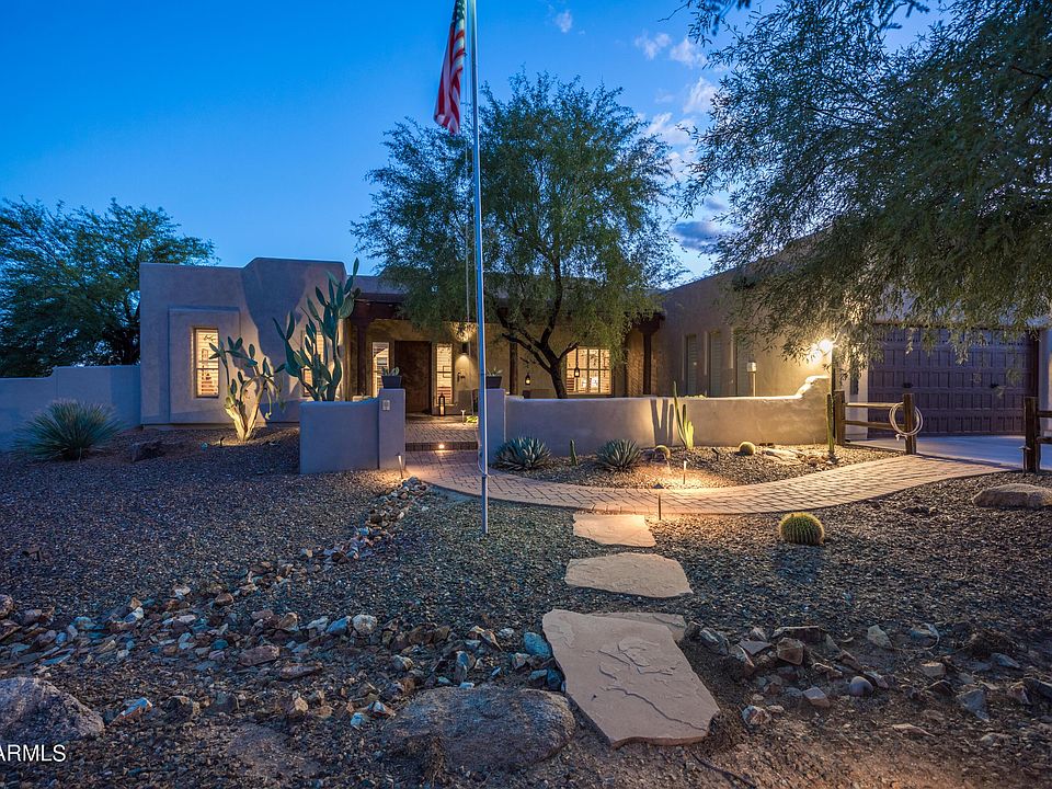 Beautiful custom home in a tranquil setting. A well-maintained desert landscaped front yard with split rail fencing welcomes you as you drive up. You enter the home by passing through a spacious courtyard. The private backyard has an extended covered patio, pool w/waterfall feature & mountain views. The interior of the home exudes a more contemporary feeling with its light quartz countertops, waterfall island, black stainless-steel appliances & stacked stone fireplace. Entertain guests in the separate formal dining or use as a 2nd living area. The home features an open & split floorplan w/ 3 separate wings providing maximum privacy for all bedrooms. The spacious primary bedroom has high ceilings & access to the outdoor patio. The 2nd bedroom has an en-suite w/ a double closet. The en-suite in the second bedroom could also serve as a pool bathroom. 3 bedrooms have wood flooring (installed in 2021), while the primary features carpeting. Great area for hiking, biking or horseback riding. Only 10 minutes to golf, restaurants, Verde River Recreation area. No floodplain, which is rare for the area!!
