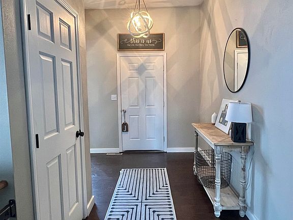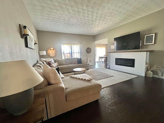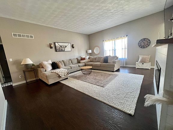 This spacious ranch home is ready to move into. The primary bedroom located on the opposite side of the home as the other 2 bedrooms allows for privacy and has a large bathroom with a double sink vanity and a walk in closet. The great room has 12' ceilings and a beautiful electric fireplace that is the focal point of the room. All of the woodwork and doors are painted white which is a beautiful contrast to the dark laminate flooring throughout the home. The kitchen has white cabinets with plenty of storage and stainless steel appliances that all stay with the home. There is a sliding door in the kitchen that leads out to a large deck. The formal dining room has 14' ceiling with plenty of space to entertain. This home shows pride of ownership...make it your today! Cinch home warranty included.