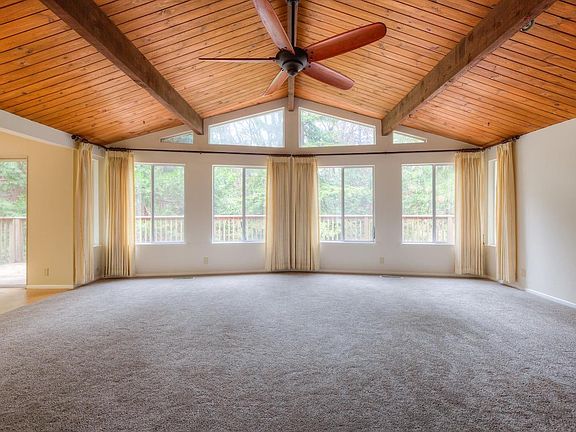 Beautiful Tahoe style home with vaulted ceilings and back wall full of windows facing out to the green belt and the beautiful pines.