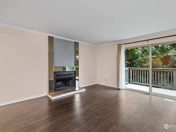 Spacious and light-filled top floor condo is situated in an unbeatable location! This 2-bedroom, 1.75 bath condo features include newer water-resistant laminate floors throughout, refreshed kitchen, living room with cozy wood-burning fireplace & granite slab, dining area, large private deck with access off living room and primary suite, forced air, storage unit & in-unit washer and dryer! One dedicated parking space is included. Condo amenities include swimming pool, tennis/athletic court, onsite manager, pet walking area and plenty of guest parking. Well-maintained complex! Just minutes away from Microsoft, Crossroads Mall, parks, shopping, restaurants, transit options, freeway access and more!