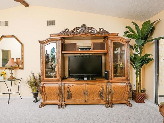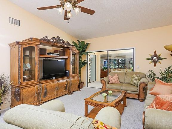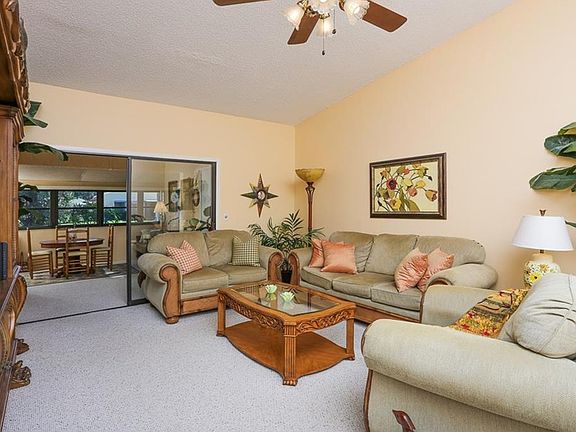 Take advantage of this unique opportunity to own one of the largest and beautifully decorated villas in the 55+ community of Meadowcroft! With almost 1400 square feet of living space, this fully furnished floor plan lives large and comfortable. Enter into the tiled foyer which opens up to a lovely dining / living space featuring cathedral ceilings, then enjoy the extended living space of the bright and open Florida room. From there you can walk out into the screened lanai for your morning coffee, or head out onto the pavered patio to enjoy the greenbelt views and outdoor patio living. With the ensuite master bedroom and bath located at the opposite end of the hallway from the 2nd bed and bath, you will appreciate the convenience of the washer/dryer located between them both. With over $25,000 in furnishings, appliances, flooring and other upgrades, all rooms are decorator designed and fully furnished with quality furnishings, accessories, TVs and more, making this home turnkey and move in ready! Other advantages include a newer A/C (2016) and newer water heater (2015). This community has tennis courts, community pool, clubhouse, and is perfectly located near GT Bray Park, area Gulf beaches, medical facilities and airport, making it one of the best values in the area. Schedule your showing today!