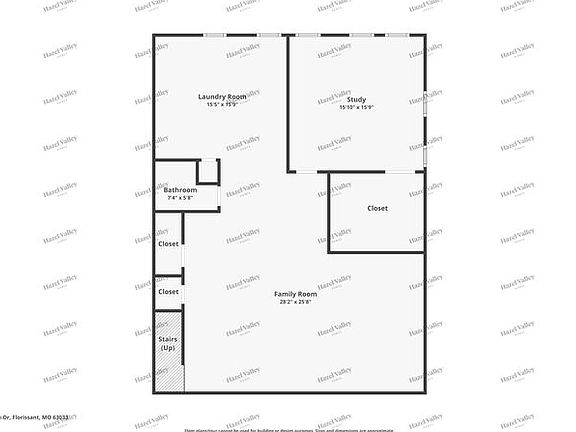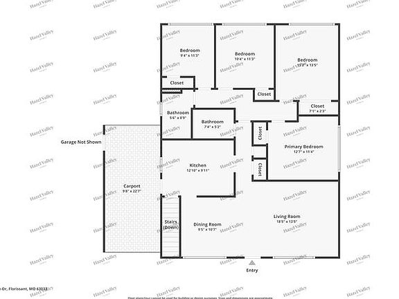 Well-maintained single-story home in Florissant, Missouri. Approximately 1,344 square feet with four bedrooms and two bathrooms. Exterior includes red brick and white siding, concrete driveway, fenced yard, and two-car garage. Interior offers hard-surface flooring in common areas, carpeted bedrooms, and an updated kitchen with granite countertops, white cabinetry, and stainless steel appliances. Bathrooms feature standard fixtures and varied finishes. Finished basement includes multiple rooms with tiled and concrete flooring, built-in storage, and utility access.