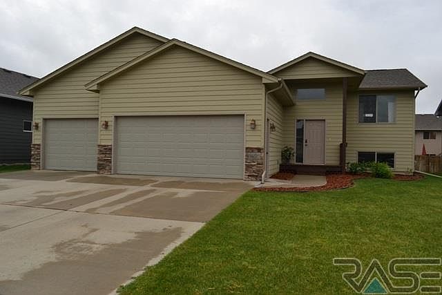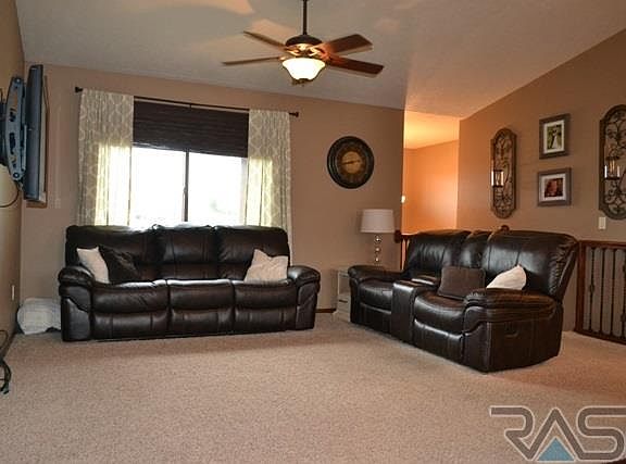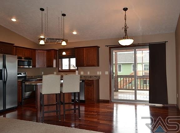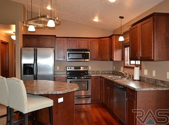 A gorgeous kitchen with cherry cabinets and Brazilian cherry wood floors highlight an impressive list of upgrades not often seen in this price point. Sharp curb appeal with striking stone accents pull you in to a large foyer with closet. Great room concept on the main floor encompasses the living room with vaulted ceiling; kitchen that also includes an island/breakfast bar; plus the dining room with sliding door to the back yard deck. Both main floor bedrooms have vaulted ceilings & big walk in closets and the master also includes a pass through door to the main floor bath which boasts double sinks! Vast lower level family room includes surround sound speakers around the floor to ceiling stone fireplace & 52 inch TV that is included in the price! An additional bedroom and bathroom can also be found in the lower level along with a semi-finished laundry with a big laundry sink. Next to a HUGE city park, privacy fenced yard with stamped concrete patio, sprinkler system, TRIPLE GARAGE