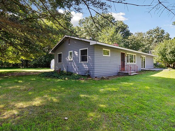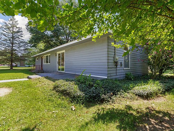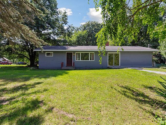 Adorable 2 bedroom (3 if you wish) 1 bath Ranch home on a huge double lot in Belding! Home has 2 living rooms in which one was also used as a 3rd huge primary bedroom w/double closets. Spacious kitchen-all appliances stay- w/ double sided fireplace into living/bedroom. Cozy dining area with sliders to the back yard. Original hardwood floors in dining, living room and both bedrooms. Big mudroom entrance with enough room to make a main floor laundry if desired. Unfinished dry basement for plenty of storage. Central Air. Door off kitchen area leads to a nice sized fenced in area. 2 sheds for more storage. Don't miss out on this one! Call today for a walk through.