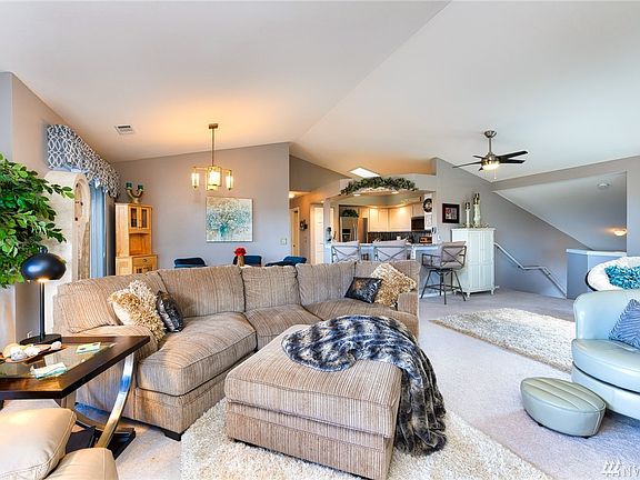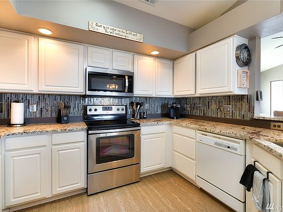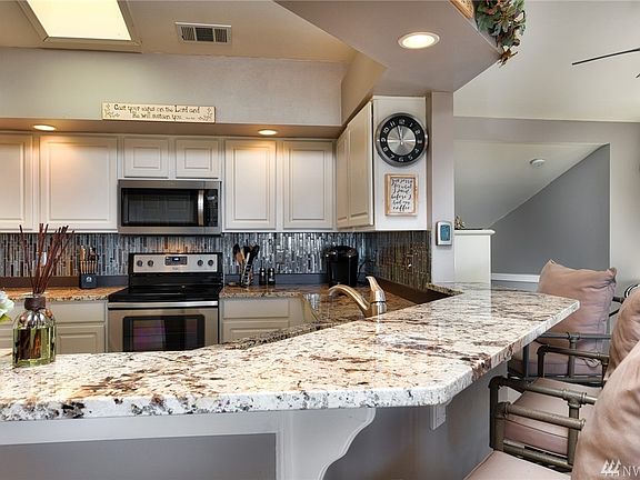 Absolutely beautiful 2 BR+ den (could be a 3rd BR) & 2 full baths. Nicely remodeled & beautiful appointed w/granite countertops, newer flooring & designer paint, 1400+ sq ft., vaulted ceilings, skylight, all new SS appliances, new light fixtures, gas fireplace, slider to covered deck. Awesome Westernly views to enjoy the gorgeous sunsets, city views, even Mt. Erie, Guemes & Orcas Island. Attached 2 car garage. Condo dues are $200/mo, includes all exterior maintenance. No age restrictions.