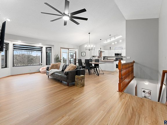 Wow! What a fabulous 4 bed (3 on one level), 4 bath home in east side Sioux Falls. Home looks like it was captured straight from a magazine! Main floor boasts gorgeous floors throughout and has such a warm feeling as living, dining and kitchen all flow nicely together. The open living room has a large bay window that lets in an abundance of natural light, brand new stone stacked gas fireplace and vaulted ceilings. Kitchen offers gorgeous painted cabinets, breakfast bar and separate pantry. 4 seasons room has heat and air (mini split) making it functional space, surrounded by windows, all year long. Primary bed offers its own private balcony, walk in closet and private 3/4 bath. An additional 2 beds and full bath are just down the hall. Main floor laundry and a fantastic 1/2 bath conveniently located right off the garage. The walkout basement is extremely functional with a large family room and a 2nd gas fireplace - just perfect for our chilly SD winters. This level also features a theatre room - bring on the movie nights! Wet bar was removed but is plumbed and ready for your own ideas! A 4th bed and bath complete this level. We aren't done - wait until you see this oversized garage with finished floors and room for all the toys! Backyard has a great patio, wrought iron fence, mature trees and great space & views. Updated windows, paint and flooring throughout the home. This one is definitely a must see!
