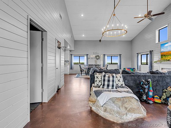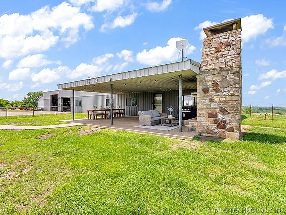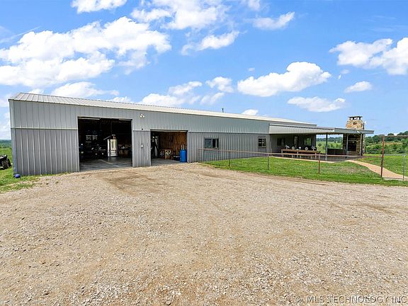 NE of Chelsea, Oklahoma, in sight of Oologah Lake, this sprawling 73-acre estate offers a serene escape into nature, the majority of the land clear and grassy, interspersed with mature trees. A striking pipe gate marks the entrance, leading up a winding drive through rolling hills to the secluded back of the property. Here, 12 acres are fenced with a 10' tall field fence. The estate is equipped for agricultural activities, featuring a large barn with an adjoining two-acre enclosure, complete with corrals and 8' field fencing. On top of the barn is a three-story bunkhouse with living quarters, including a bathroom and kitchen. The pinnacle of this rustic retreat is the wrap-around viewing deck on the top story, offering panoramic views of the lush pastures below and stretching to the scenic vistas of Lake Oolagah.