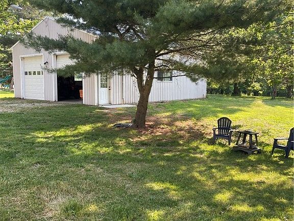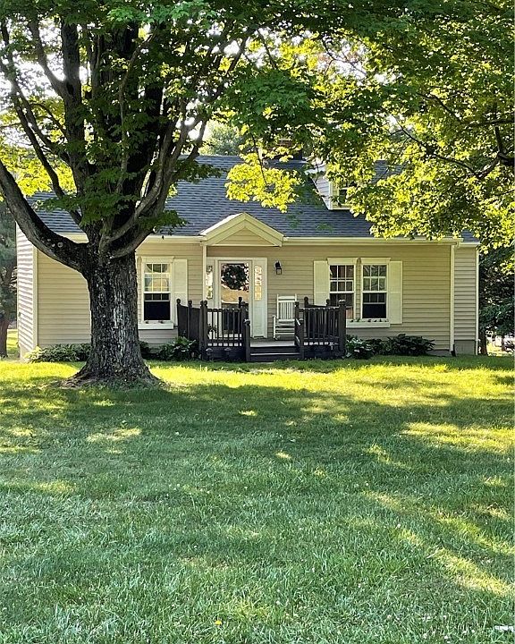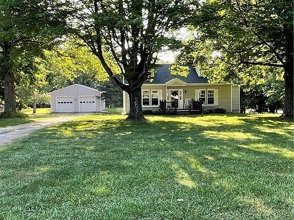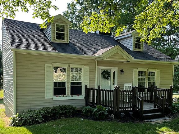 This cape cod home has a first floor bedroom with half bath. There are a total of 3 bedrooms with two and a full bath on second floor. There are many updates! New roof, gutter and downspouts May 2023, New garage doors 2-23-2012, new septic 7/17/2015, full bath updated 2021, half bath updated May 2023, new carpet just installed in hallway and stairs. Seller did not carpet other rooms so you can see the hardwood floors. Wood boring insect inspection was done for your convenience May 2023. There is 1.24 acres. This property also features a 6 CAR garage! Seller is offering a 1 year home warranty.