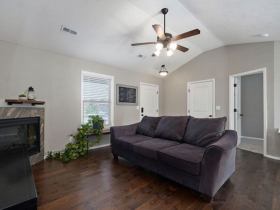 Take a look at this aesthetically pleasing home! Trendy black shutters against brick and warm toned materials. It has the look and feel of a new build but with the presence of mature landscaping! Step inside to find beautiful dark wood floors and a warm gas fireplace. This split floor plan offers the primary bedroom optimal privacy. The attached bath has a walk-in shower, closet, and duel sinks! An additional room has been added in the garage for a potential 4th bedroom, office, living room, or storage! Take a step out back and enjoy your privacy fenced backyard. Also, did I mention, PAID OFF SOLAR PANELS? Thats right, the absolute icing on the cake. Enjoy lower electric cost. Hurry and schedule a showing today!