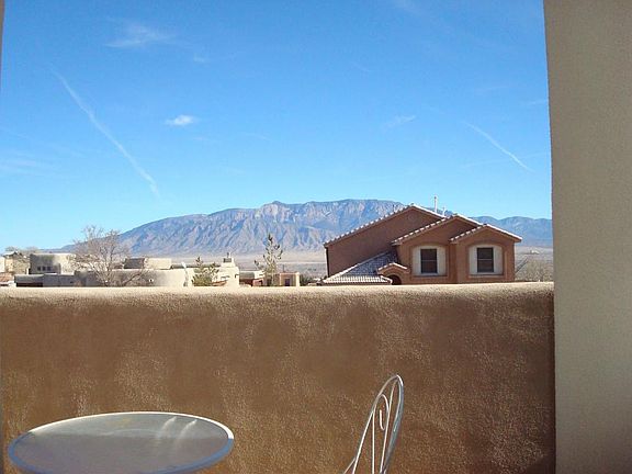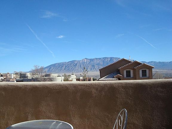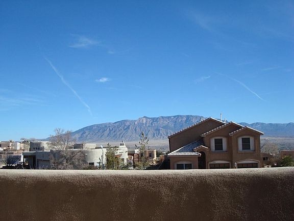 Views of the Sandias from the Second Floor Balcony, Pella Wood Windows, Wood Entry Door, Upgraded Wood Floors (dining area/living area), new back splash tile in kitchen area by sink, Quarry tile Throughout, Kiva Style Fireplace, Landscaped backyard with new red square bricks for a place for a pop up pool or patio set.