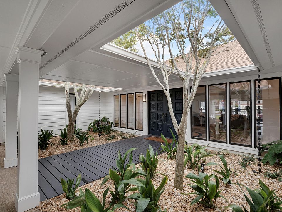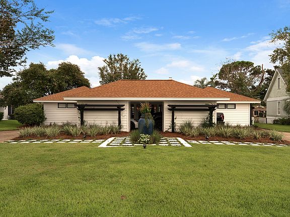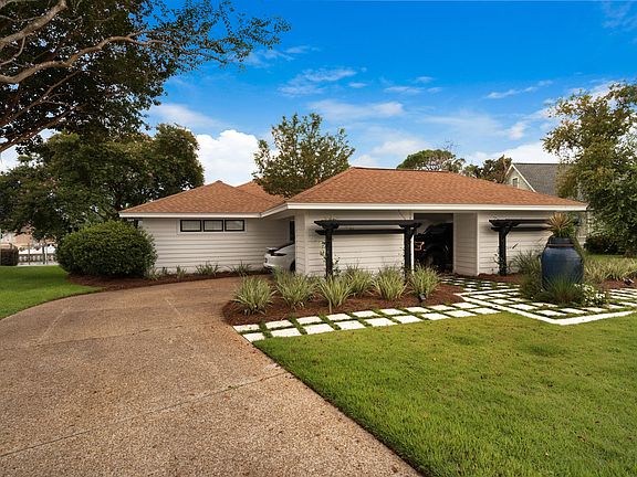 Welcome to 1405 Trout Drive, a remarkable waterfront residence in the much sought after Bay Point community. Boasting over 100 feet on the protected canal makes this a yachtsman dream. Entering the home through the elegant front courtyard, you are greeted with beautiful elevated shiplapped ceilings with a panoramic view of the Bay Point canal. The very large living area features an open floor plan leading you into the waterfront kitchen with quartz countertops and stainless appliances. The kitchen has entrances into the enclosed patio with infinity sliding screened doors for the ultimate adaptability to the Florida weather. Leading off the covered patio you will be greeted with a very large open deck.