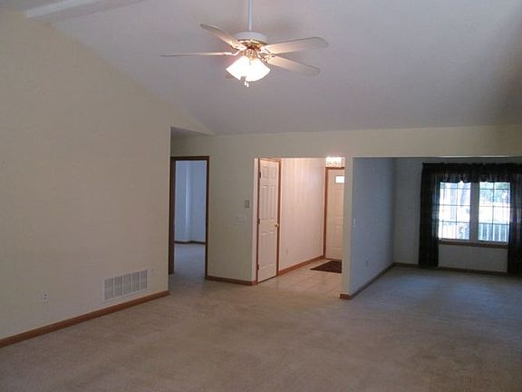 Home features 1705 sq. ft. with open floor plan, freshly painted neutral décor, great room with fireplace and cathedral ceiling, formal dining room or den, three bedrooms, and two full baths. Spacious kitchen has plenty of cabinets, breakfast bar and dining area. Appliances include stove, refrigerator, microwave, and dishwasher. Master suite includes walk-in closet, his and her sinks, whirlpool tub and separate shower. Two car attached garage included. Enjoy your evenings on the open front porch or the patio in the backyard with mature trees. Priced to sell.