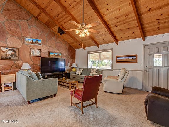 COZY COUNTY LIVING AT IT'S FINEST! HARD SURFACE ROAD. CIRCLE DRIVE. WELL MAINTAINED PROPERTY. TOUNGE AND GROOVE GREAT ROOM WITH VAULTED CEILING. HUGE LOFT (CURRENTLY USED AS OFFICE) THAT COULD BE CONVERTED INTO A BEDROOM. ALSO INCLUDES A GUEST ROOM WITH A BATHROOM VERY CLOSE BY (HOWEVER GUEST ROOM DOES NOT INCLUDE A CLOSET). OVERSIZED THREE CAR HEATED GARAGE WITH LOTS OF WORK SPACE. ABUNDANCE OF MATURE FRUIT TREES ALL ON DRIP. ADDITIONAL STORAGE BUILDINGS AND CAR PORT. LARGE BACK DECK WITH COVERED AREA THAT INCLUDES A SPA. COVERED PORCH IN FRONT TO ENJOY OPEN VIEWS OF THE SAN FRANCISCO PEAKS AND BILL WILLIAMS MOUNTAIN. LARGE 2.3 ACRE LOT THAT WILL ACCOMMODATE YOUR HORSES. LARGE FENCED IN REAR YARD FOR YOUR SMALLER DOMESTIC PETS. GARAGE IS AIR CONDITIONED.