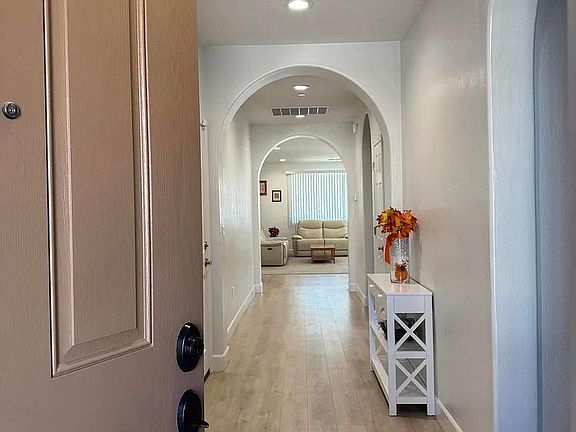 The home you have been waiting for is here! Gorgeous Shannon Park subdivision single story 3 large bedrooms with walk-in closets, a spacious Den that can easily be converted into a 4th bedroom, 2.5 baths, 9 ft. ceiling with arches. But the centerpiece of this house is the oversized kitchen with a giant island that makes this home very enjoyable, big walk-in pantry, stainless steel appliances, convection oven, can lights, quartz counter tops. Huge covered patio awaits for you to relax and unwind. Concrete all around the home, handmade storage shed, 3 car garage with several dedicated electrical plugs, pre-wired for an electric car. Perfect space for a workbench, storage, and much more. Many upgrades from the original plans, such as, extended cabinets, quartz countertops in kitchen and bathrooms, all stainless-steel appliances, recessed lighting throughout the home, under cabinets lighting, touch operated kitchen faucet, gas stove top, extended patio, motion sensing lights in bathrooms, Insulation of all interior walls, laundry room, garage and many more features. The home was repainted with eggshell paint for easier cleaning. There is an air filtering system in addition to the A/C.Weather monitoring irrigation system. Solar panels are paid for and seller receives a credit from SCE