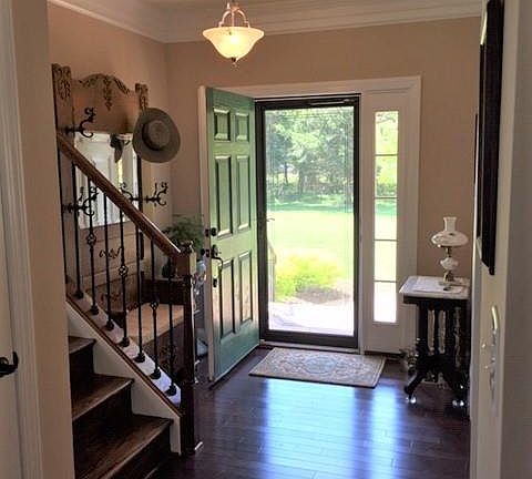 Privacy & Perfect describes this brick & vinyl open transitional- aggregate walkway to country front porch on 2 secluded acres. Home offers 2,500 sq ft living space-4 Bedrooms & 2.5 Baths. Hardwood & ceramic floors thru-out! Crown molding, 9' ceilings, tray ceiling in dining room, & cathedral ceilings in sunroom. The kitchen has ample 42" custom cabinets, island, granite counter tops, stainless appliances & butler's pantry with 2 beverage coolers! Family room offers crown molding, natural light, gas fireplace expanding to sunroom & kitchen perfect for entertaining. Upstairs: 4 bdrms, 2 full baths. Master with walk-in closet & 2 large closets leading to the master bath consisting of soaking tub, shower, 2 marble topped vanities, a plus in the mornings. Hall bathroom is adorable, marble topped vanity as well. Come & relax on the back deck, with a retractable "Sunbrella", it doesn't get much nicer than that! Bonus- A perfectly planned yard, with fruit trees, grape vines and raised beds in the garden. Do you need more storage? Check out the large 2.5 attached garage, 1 detached garage, and storage shed. Award winning Hanover schools!