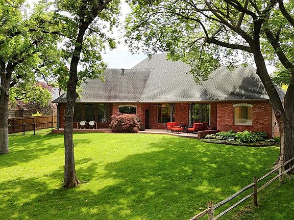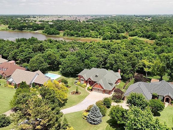 Welcome to your private wooded retreat in North Edmond! Nestled on a scenic 1-acre lot with stunning waterfront views, this home offers a peaceful, park-like setting with mature trees and year-round vistas of the water from the backyard and rear-facing windows. Step inside to a front living area bathed in natural light from picture windows that frame the lush backyard. A formal dining room at the entry overlooks manicured landscaping in the front yard, setting a refined tone. The kitchen, designed for both entertaining and everyday living, offers generous space and panoramic views of the water and backyard. Just off the kitchen is a cozy second living room featuring a vaulted ceiling with rustic wood beams and a beautiful stone fireplace. The spacious primary suite is a true sanctuary, with a tray ceiling and tranquil water views. The en suite bath boasts a whirlpool tub perfectly positioned to soak in the scenery, a large walk-in shower, double vanities, a dedicated makeup station, and a massive walk-in closet. A separate office—complete with built-in bookcases and a full bath just outside—could easily serve as a private guest suite. On the opposite side of the home, two additional bedrooms share a hall bath. Upstairs, you’ll find a versatile bonus room with a large walk-in closet and a recently remodeled full bathroom, ideal as a playroom, media room, or additional bedroom. Step out onto one of two rear patios to relax, host gatherings, or simply enjoy the tranquil setting and breathtaking views. This remarkable property is a rare opportunity to own a slice of serenity in North Edmond.