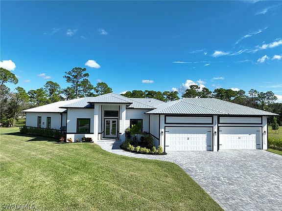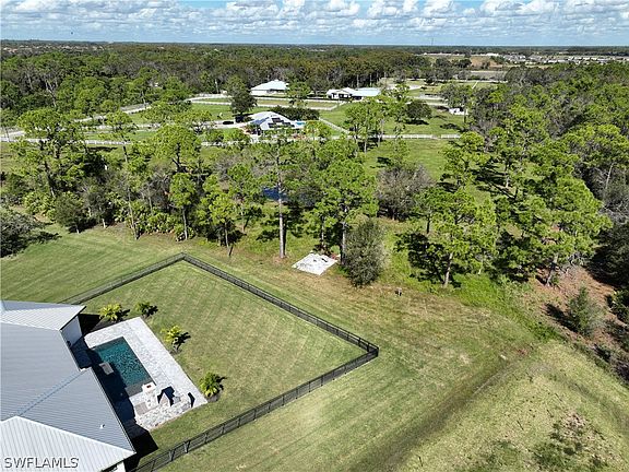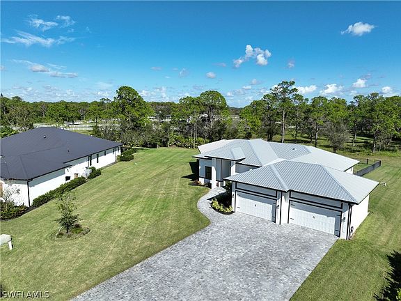 Welcome to this beautiful 2021 custom built home on One Acre with Two Primary Suites plus a 3rd bedroom with an ensuite and a den or 4th bedroom. Also, no cost or worries to replace old windows and doors as this house already comes with all HURRICANE IMPACT WINDOWS AND DOORS. When you enter the foyer this home boast 12' Ceilings plus the new Vinyl Flooring throughout, along with a large eat in dining/entertaining area. Off the dining room the kitchen offers an oversized island, built in wine cooler, a deep farm sink plus a walk in Pantry. Right away you'll notice the Florida's open room concept welcoming family and friends gatherings plus the stone wall and electric fireplace. Let in the warm winter breeze when you open the french doors off the family room then step outside onto your extended paver covered lanai with breath taking view of your custom Pool/Spa. If you like to entertain this lanai won't disappoint, the Extra Large Big Green egg will get it all started, grab some cold drinks from the built in wine color and have your breakfast, lunch or dinner on the patio. There is plenty of space on the outside counters for your get togethers along with TWO TV'S for your favorite sports or binge watching. Relax in the winter months with the smell of your oak burning firewood in this one of a kind custom built Stone Fireplace while watching nature or spending time in the heated Pool and Spa. Oh yes let's not forget to mention this amazing house has an EXTENDED FOUR CAR GARAGE with 14' ceilings for all your toys and storage needs. Remington Oaks neighborhood offers county living without being miles from city life. Downtown Ft. Myers is only 9 miles away as well as the famous Boat House Tiki bar. Shopping and schools close by too. Low HOA Fee that includes your Wifi. A must see before it's gone.