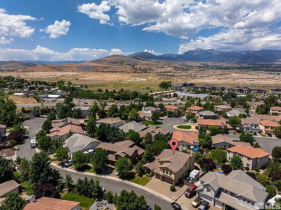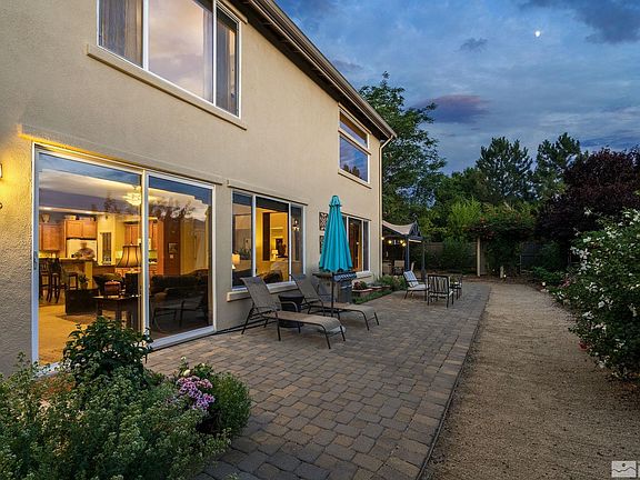 Extra special home in Curti Ranch! Beautiful mountain views. Wonderful open floor plan has island kitchen open to family with fireplace and access to charming, private yard with paver patio. 4 bedroom, 3 bath. 1 bedroom& bath on main level. Versatile bonus room-currently used as an art studio, would make a great play room or home office. Lots of storage inside, plus a storage building in backyard. RV parking area. Large primary suite, great views and large bath. Fantastic location and peaceful ambience., Curti Ranch is a wonderful neighborhood in South Reno, with access to miles of recreation paths and close to all conveniences and outdoor recreation. Clean and ready for new owner. New paint 2023. GE profile appliance, new dishwasher 2023 and stovetop 2024. Hunter Douglas window coverings. Lots of storage!