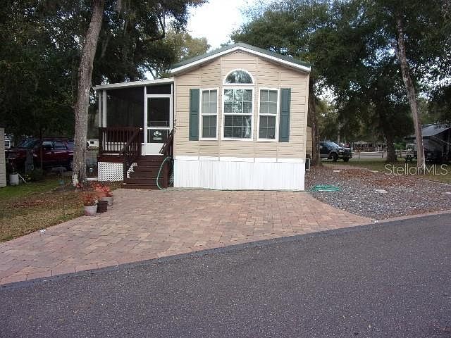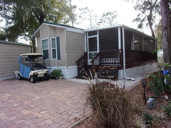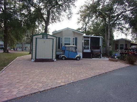 This "like new" 2016 Skyline Park Model is very well made and beautiful! It has a metal roof, is well insulated with sheet rock walls (no paneling), crown molding throughout the home, 3 Bay Windows, spacious kitchen-dining-living area with great built-in storage areas & a very nice bedroom with built-in cabinet above bed area and good closet & drawer space as well. Has sliding glass doors in living room leading out to a 10' x 30' screened porch, and down into yard with nice pavers & rock for parking & guests, shed with washer & dryer hook-ups, firepit and nice landscaping including shade trees. This listing also includes a golf cart.