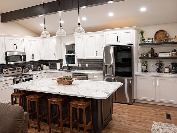 Beautiful, open concept home located in a great area. Amazing neighbors, neighborhood, near restaurants and walking trails. The upstairs includes a fully updated kitchen with brand new flooring, carpeted bedrooms, open vaulted ceilings, brand new appliances that stay with the home, and a 9 foot island to comfortably sit 8-10 people with storage all the way around. This house is the real deal! A full bathroom both upstairs and downstairs and 2 bedrooms on each floor. A living space both upstairs and downstairs provides plenty of room for everyone! Newer windows and roof. Great, large yard. Walk out deck from the kitchen and a 2 car garage with plenty of room for storage! Wood burning fireplace both downstairs and upstairs!