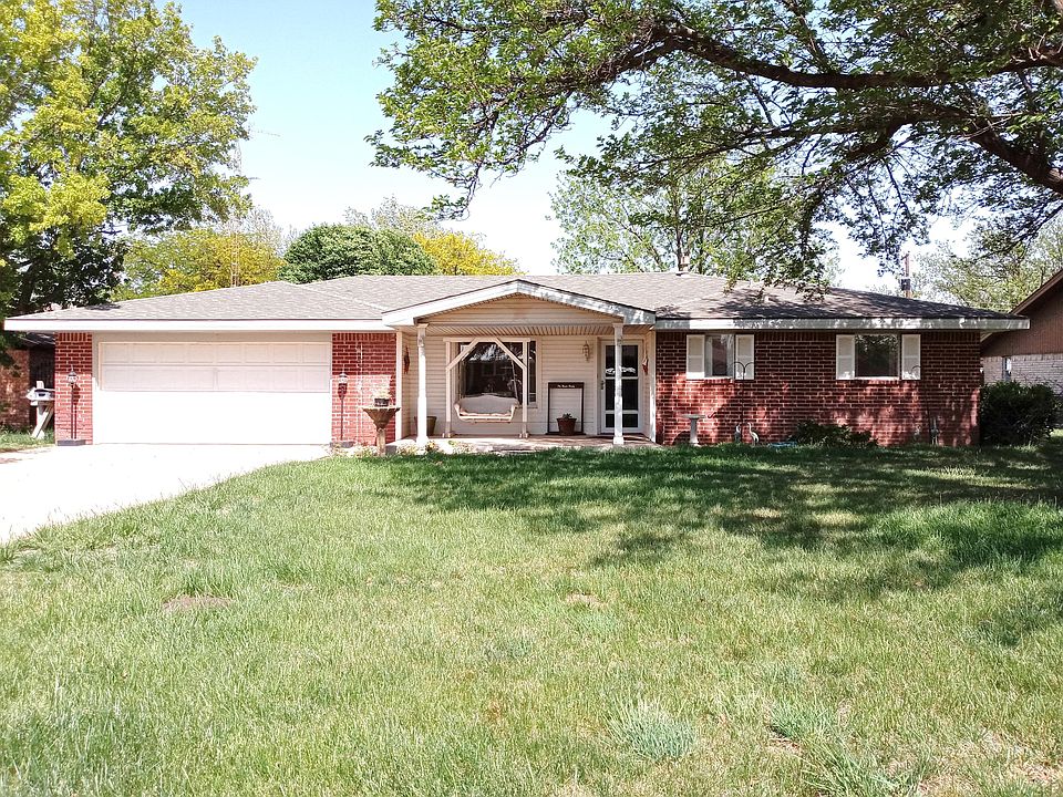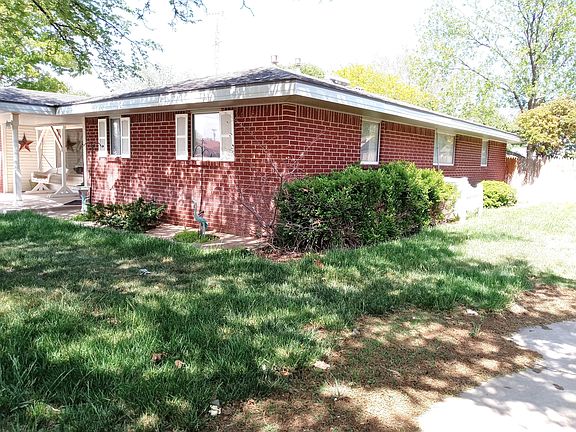 Very nice, brick, 3 bedroom, 1-3/4 bath, 2 car garage home with a safe room. The large living room has a fireplace. The beautiful kitchen has lots of cabinets, crown molding, a large walk-in pantry, and a large island which consists of an eating bar with cabinets underneath. There is a large adjacent dining area with lots of windows and crown molding. The large utility room has room for an extra refrigerator. There is an office/study. The master bedroom has two closets and a nice 3/4 bath. The other two bedrooms have walk-in closets. The garage has an insulated garage door and a storage area. The front and back yards have an auto sprinkler system and the grass is green. The back yard has three storage buildings, several large trees, a large patio.