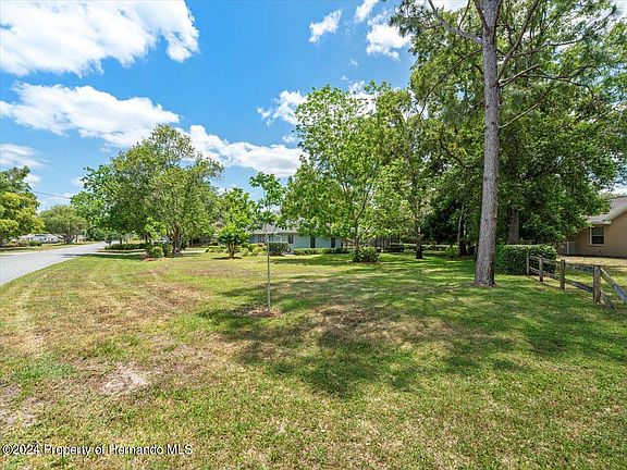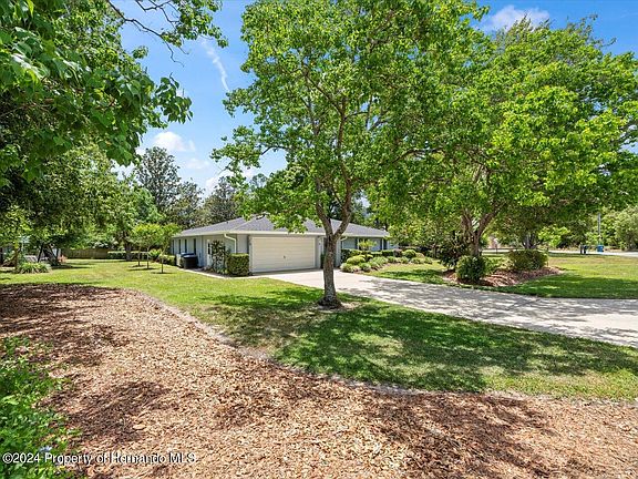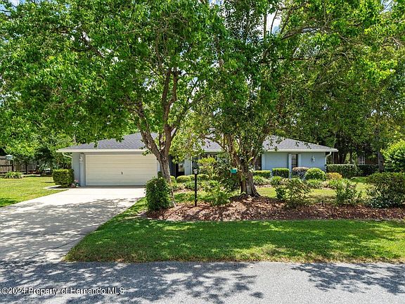 You'll feel at home as soon as you step into the warm welcome of this lovely 3-bedroom, 2-bathroom ranch. The entrance foyer leads to the sunken living room. The ceilings add comfortable airflow and a sense of spaciousness. The centerpiece of the Family room is a wood burning fireplace that inspires gathering and conversation. The kitchen, which is large enough to accommodate guests who wander in to talk, is recently updated, and is a visually appealing recipe of marvelous counter space and premium appliances. The U-shape configuration maximizes roominess and accommodates multiple cooks (or visitors). With ample closet space for wardrobes and linens, the well-designed primary bedroom is newly updated and has a private bathroom attached (walk-in shower). In addition to the convenience of the private bathroom with granite dual sinks, you will find plenty of walk-in closet space to let your wardrobe breathe. No need to take up space here with towels and sheets. Plenty of dedicated space for those in the separate linen closet. Also: large shower. The other 2 bedrooms, with plenty of closet space, offer the convenience of ground floor accessibility. The large yard is attractively landscaped with beautiful trees and shrubs and the rear yard boasts many fruit bearing trees; 3 pecan trees, 2 orange trees, 1 lemon tree,1 fig tree, Papaya, Pineapple, Banana and Blackberry bushes. A driveway with ample accommodation for two vehicles leads to an attached two-car garage that is available for its original purpose or for use as additional flex space. Your outdoor furniture transforms the solid floor patio into an open-air lounge, an ideal foundation for socializing, but also simply a great place to wind down after returning home from Veterans Memorial Park. Make (or dodge!) a splash in the 8 foot deep swimming pool, the social and sapphire centerpiece of the backyard. The property site also includes a large lanai. Standing on a tranquil, low-traffic street lined with trees, the home is within pedestrian range of the natural beauty of Veterans Memorial Park. Various shopping and dining destinations are within comfortable driving distance. Impressive views of the woodlands, the swimming pool, and the garden greenery are an everyday treat. this property also has a deep well for irrigation. This lovely home is a special opportunity in the prime Spring Hill neighborhood. Roof 2021. HVAC 2024. You'll thank yourself for getting your offer in early