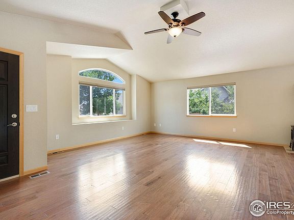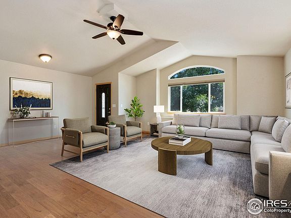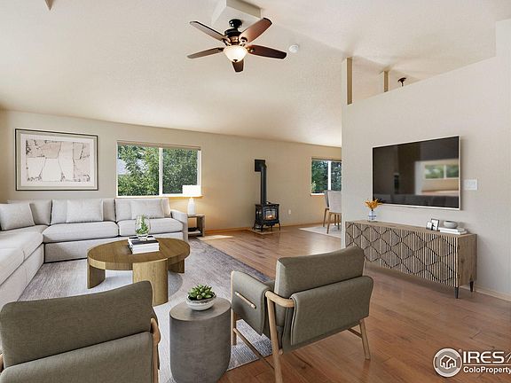 Discover this immaculate 4 bed/3 bath ranch-style home located in the coveted Seven Lakes neighborhood. A spacious main living area boasts expansive windows and vaulted ceilings, providing loads of natural light. The open concept floor plan features hardwood floors throughout the main level, leading seamlessly from the large kitchen with stainless steel appliances and oak cabinets to the oversized dedicated dining room. Adjacent is a delightful sunroom, ideal for enjoying picturesque Colorado mountain sunsets. The spacious primary bedroom offers a large walk-in closet and en-suite bath with a walk-in shower and double sinks. The basement includes a fourth bedroom with a walk-in closet and a generous three-quarter bath, another pellet stove and ample additional storage and partially finished space for further customization. Outside, the fully fenced backyard includes a shed for extra storage and raised garden beds. Additional highlights include an oversized three-car garage with custom ramp, epoxy floors, and a pellet stove. Enjoy the convenience of living near Lake Heinricy and Lake Westerdoll, with access to non-motorized water recreation, private trails, bike/walking paths and expansive open spaces. This home offers a rare opportunity to embrace the best of Colorado living in a highly desirable neighborhood.
