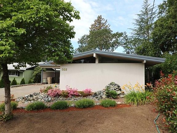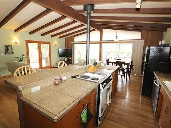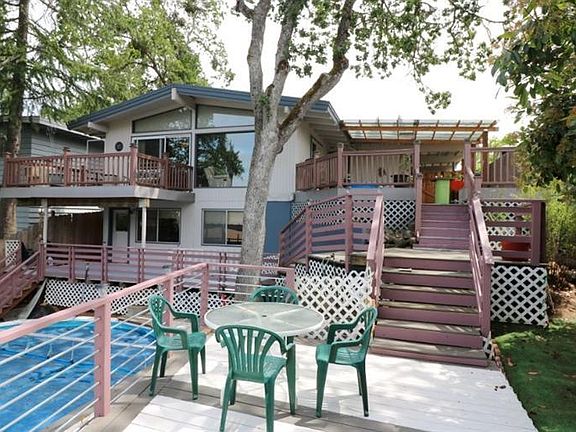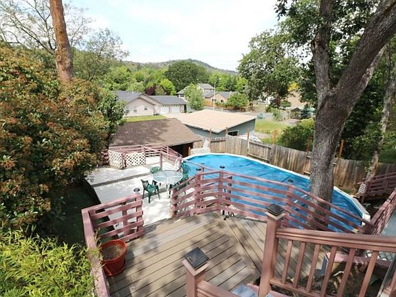 Entertainer's Paradise! Mid century modern style home with flowing floorplan, extensive multi-level decking, above ground pool and views! Relax by the pool or host a BBQ and have room for everyone. The inviting open great room is a wonderful gathering spot and features an island kitchen with raised bar, vaulted ceiling with wood beams, solid wood floors, large picture windows, gas stove and 2 sets of doors leading to the decks. There's also 4 bedrooms and 2.5 baths including the large basement level room that could be a great home office or recreation room and has a closet, storage and doors to the lower deck. The master bedroom also has vaulted and beamed ceilings, double closets and private bathroom with double sinks and step-in shower. The home is complete with attached carport, detached 2 car garage with access from Gilbert Way, laundry room and is beautifully landscaped with a water feature in the front yard. Located in town with city schools and services.