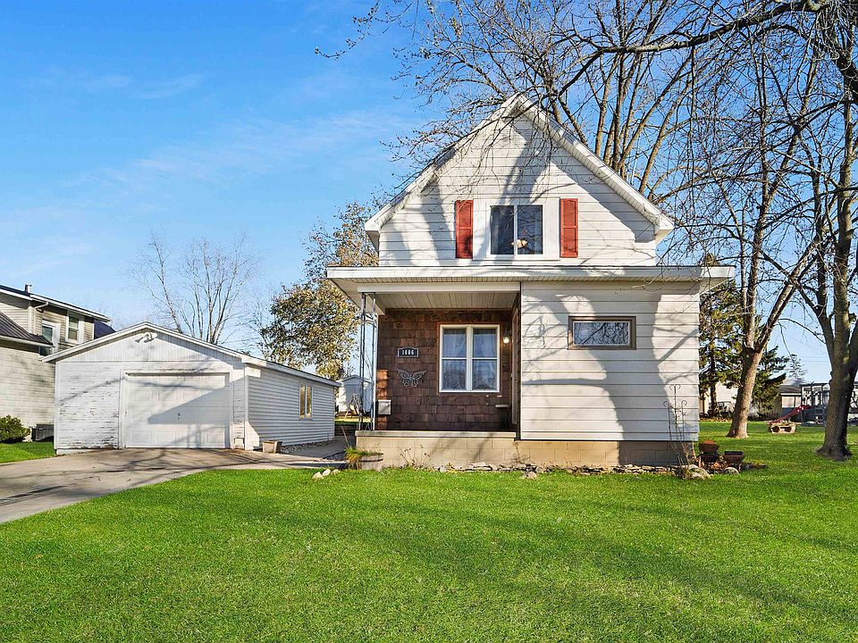 This affordable 1.5 story home offers a generously sized lot with beautiful mature trees and a heated 1.5 car garage. The main floor showcases hardwood floors in the living room as well as the formal dining room. The living room features an exposed brick chimney, adding a touch of character to the home. The quaint but functional kitchen is equipped with a custom built-in cabinet area with space for a coffee bar and additional storage! The exterior offers a nicely landscaped fire pit with plentiful seating, a storage shed, and a paver patio perfect for entertaining. Have peace of mind in owning an affordable home with a newer furnace and water heater! The furnace has been set up for the future installation of central AC. The basement has also been stubbed for an additional full bathroom!